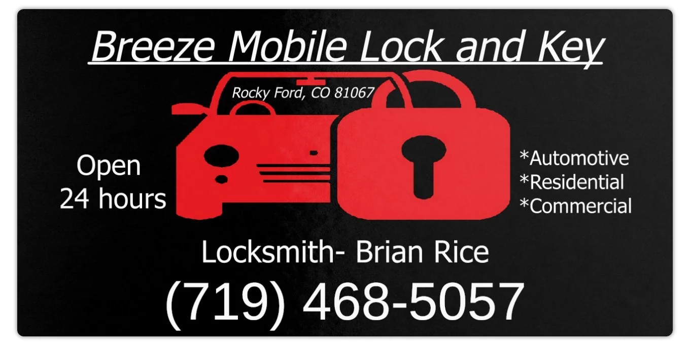 Breeze Mobile Lock and Key provides comprehensive, professional locksmith services throughout Rocky Ford, CO and the surrounding communities. We are a fully mobile operation, arriving equipped to handle virtually any residential, commercial, or automotive lock and key need on-site, day or night. Call now for a free quote or estimate.